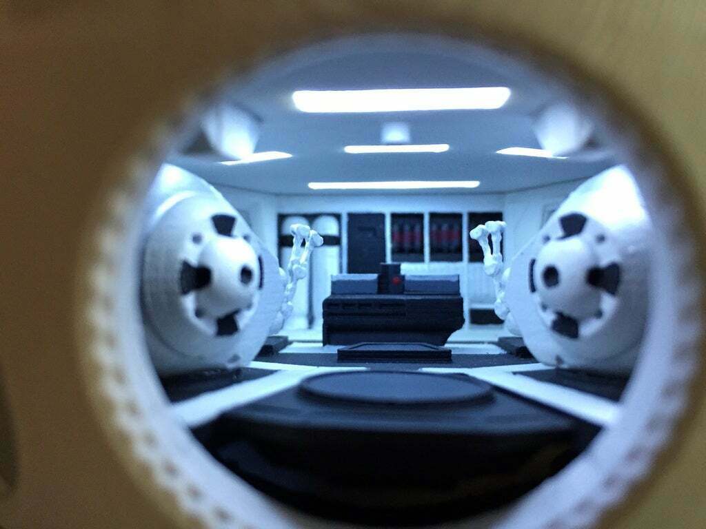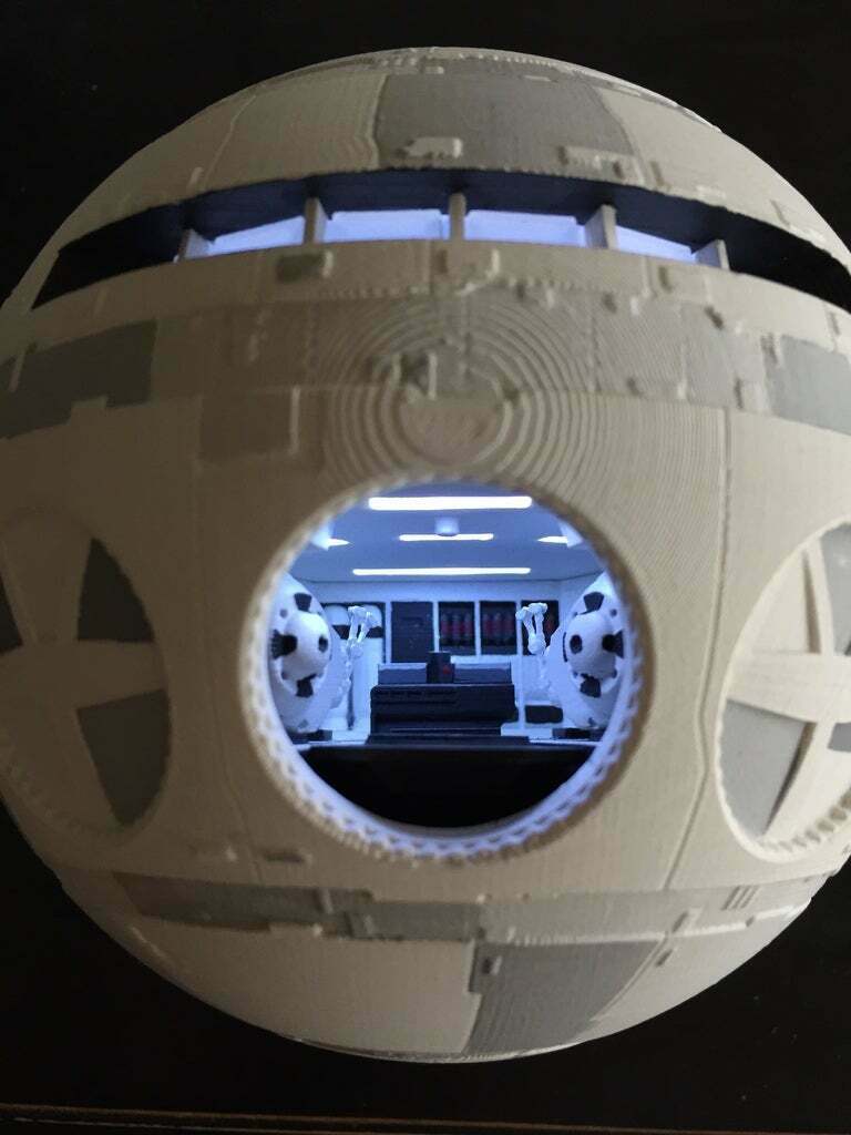 This is the bulk of my contribution to this remix. Included is pod bay model which features a sliding platform and translucent lighting fixtures for easy LED installation. The pod bay is designed to be assembled separately and then fitted inside the sphere.